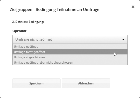 Alternativ können Sie Ihre Abonnentenlisten per Blacklistabgleich bereinigen. Damit löschen Sie Abonnenten aus Ihren Abonnentenlisten, deren E-Mail-Adresse auf einer Blacklist steht. *Hinweis: Der Zielgruppentyp 'Blacklist' betrachtet ausschließlich die Blacklist Ihres eigenen Accounts. Der Versand berücksichtigt zusätzlich auch übergeordnete Blacklists. Bedingung anhand des ÖffnungsverhaltensErstellen Sie Bedingungen anhand des Öffnungsverhaltens der Empfänger in einem bestimmten Mailing. Bedingung anhand des KlickverhaltensEmpfänger eines Ihrer Mailings, die einen ausgewählten Link geklickt bzw. nicht geklickt haben, separieren Sie anhand dieses Typs. Bedingung anhand der UmfrageteilnahmeMit dieser Bedingung filtern Sie, welche Abonnenten an einer personalisierten Umfrage teilgenommen haben. Anonymisierte Umfragen stehen nicht zur Auswahl, da sich deren Reaktionen nicht abonnentenbezogen auswerten lassen. Sie können abfragen, ob der Abonnent die Umfrage lediglich geöffnet hat (Umfragelink geklickt), oder ob er sie tatsächlich beantwortet und abgeschlossen hat.