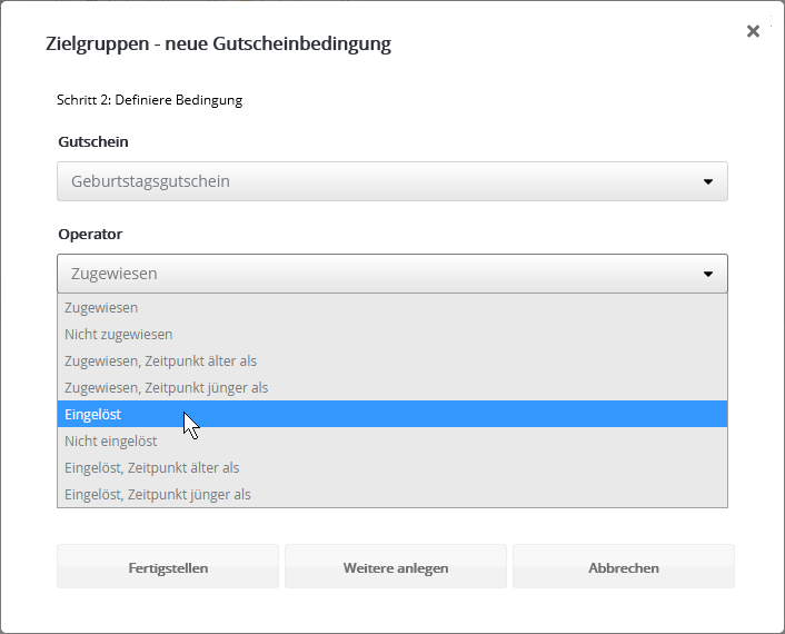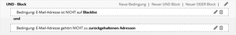 Insbesondere nach dem Kopieren einer vorhandenen Zielgruppe kann das sinnvoll sein, wenn die identischen Abonnenten in Original und Kopie nicht gewünscht sind. Bedingung anhand GutscheinFiltern Sie Abonnenten danach, ob und in welchem Zeitraum die Zuweisung oder Einlösung eines Gutscheins stattfand. Tipp: Um zugewiesene Gutscheine als eingelöst zu markieren, nutzen Sie entweder die Webservice-Funktion 'RedeemVoucherByCode' oder importieren in der Gutscheinübersicht eine CSV-Datei mit den eingelösten Gutscheincodes. Bedingung anhand SelektionMit diesem Bedingungstyp nutzen Sie eine per Webservice angelegte Selektion von Abonnenten als M-Tool-Zielgruppe. Der Bedingungstyp ist nur dann sichtbar, wenn per Webservice mindestens eine Selektion angelegt wurde. Das Besondere: In einer Selektion werden Abonnenten anhand einer Liste von IDs gruppiert. So lässt sich eine extern getroffene Abonnentenauswahl als Zielgruppe nutzen, ohne dass in den M-Tool-Abonnentendaten ein gemeinsames Merkmal vorliegen muss. Die Details entnehmen Sie bitte der Webservice-Dokumentation, die wir Ihnen gern zusenden. Bedingung anhand des Empfängers (geplant)Diese Bedingung entscheidet, ob ein Abonnent als Empfänger eines bestimmten Mailings vorgesehen war oder nicht. Das bedeutet, dass er in einer Abonnentenliste bzw. Zielgruppe für ein bestimmtes Mailing steht, welches versandt wurde. Im Unterschied zur letztgenannten Bedingung wird der tatsächliche Empfang jedoch nicht geprüft. Es sind auch alle Empfänger enthalten, die das Mailing z. B. aufgrund von Bounces, Blacklists oder serversseitigen Spamfiltern nicht empfangen haben. Bedingung anhand des Empfangens (zugestellt)Diese Bedingung entscheidet, ob jemand ein bestimmtes Mailing empfangen hat oder nicht. Das Mailing gilt als empfangen, wenn der E-Mail-Server des Abonnenten eine positive Rückmeldung erteilt hat. Im Schritt nach dem Empfang ist es dennoch möglich, dass das Mailing beim Empfänger in einem Spamordner landet. Bedingung anhand des BounceverhaltensDamit legen Sie Bedingungen anhand der Zustellungen oder Nichtzustellungen eines bestimmten Mailings an. Bedingung anhand Blacklist bzw. Zurückgehaltener AdressenAbonnenten, deren E-Mail-Adresse auf einer Blacklist oder der Liste der zurückgehaltenen Adressen steht, werden automatisch vom Versand ausgeschlossen. Dieselben* Abonnenten lassen sich per Zielgruppe filtern, etwa um sie beim Export Ihrer Abonnentendaten ebenfalls auszuschließen. Die kombinierte Zielgruppe sieht wie folgt aus: