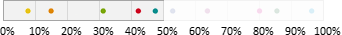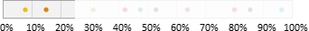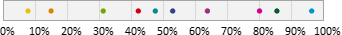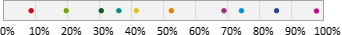 Auswahl-Wahrscheinlichkeit in ProzentGeben Sie einen Prozentwert zwischen 0 und 100% ein. Mit dieser Wahrscheinlichkeit gehört ein Abonnent zur Zielgruppe. Beispielsweise bewirkt ein Wert von 25%, dass ungefähr (siehe Hinweis) ein Viertel aller Abonnenten zur Zielgruppe gehören. Dazu verteilt M-Tool alle Abonnenten auf einem Zahlenstrahl zwischen 0 und 100%. Bei 10 "bunten" Abonnenten könnte eine Variante so aussehen: