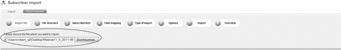 Save the file as a file with the feature 'CSV (Comma delimited)'. Apple user: If you own an apple computer, you will have to safe the file as 'CSV-Windows'. M-Tool does not run files in the Mac format. Step 1 – Import fileOn the navigation bar click on 'Subscribers' and then go to the navigation subitem 'Import'. This is the way how you get to the menu-guided import function of M-Tool. First, you will have to choose the file which you want to import; |