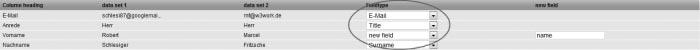 if the first line of your address file contains (as shown in the example above) the column headings, leave the item 'First line contains column headings' marked . Otherwise, if your address file starts right away with the subscriber data, unmark this option. Step 3 – Subscriber ListsChoose the subscriber list to which you want to import the addresses. Subsequently click on 'Next'. Step 4 – Field MappingNow you are asked to match the field names of your subscriber data with those of M-Tool. In order to do so, please choose in the drop down menus the associations which correspond to field information displayed to the left of these menus. If there does not exist a matching subscriber field, choose 'New Field' and enter a name for the subscriber field that needs to be created. Click 'Next'.