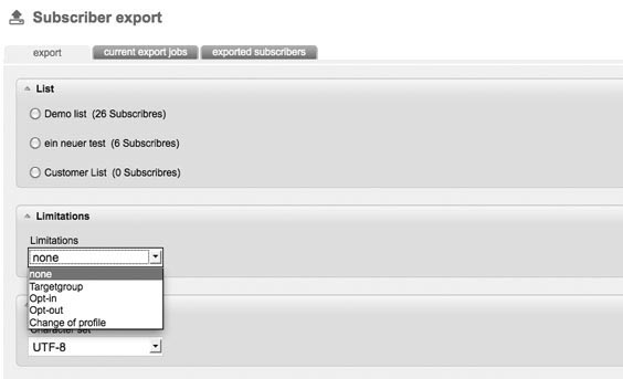 Subscribers lists can be exported from M-Tool as CSV – files. An advantage, for example, is that you can back up the address lists in this way. In the tab 'Export’, you can make choices of the lists that have to be exported. Per export only one subscriber list can be chosen. If you only want to export certain data records, you can decide on 'Limitations’. |