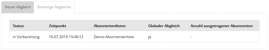Daraufhin startet M-Tool den Abgleich. Im Reiter 'bisherige Abgleiche' können Sie den Status des Fortschrittes einsehen. Nach Fertigstellung wird Ihnen die Anzahl der ausgetragenen Abonnenten angezeigt. |