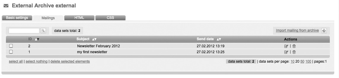 All mailings, which should be offered in your external archive are residered here. Click 'Import mailing from archive' to import a mailing. You can also assign a mailing to an external archive (to which it should be included later) before dispatching (read more here: Settings).