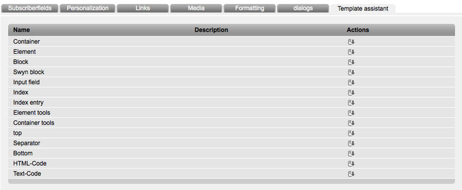 Images aren't displayed in the textpart of a newsletter, so you don't have to populate those image-inputs compulsory into the textpart. If you still want to incluce those image-inputs into your textpart, there just will be shown the url of the image in the text. Just place fixed elements of your newsletter between the placeholders. Don't forget to save your text input. Tab Text preview:Here you can check your text and the structure of your different inputfields. For further comprehension:With Element- and Container-Tools you have the possibility to define icons in your E-Mail-Template for editing, creating, sorting and removing your elements in your newsletter. They are just displayed in editing-mode of your html-email. |
