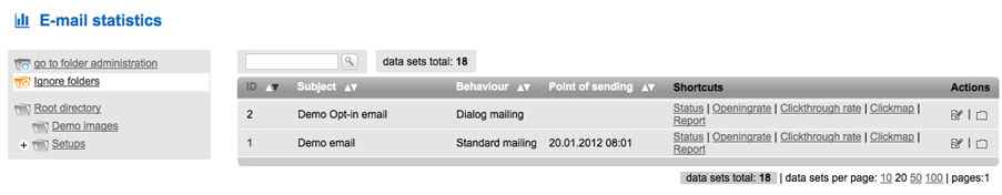 Here you find the statistics of all sent mails. For easier access M-Tool already includes a demo-mail you can view. |