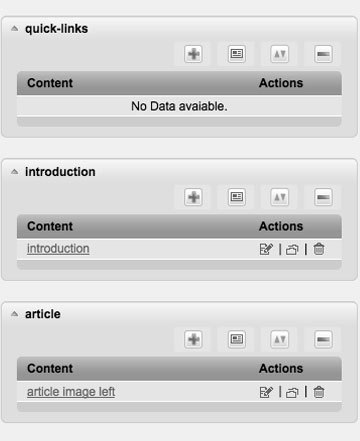 On the left side, you can find elements of content which may be created, edited or deleted. Depending on the created template, different elements in different order may be found. You will find following elements in the basic template: