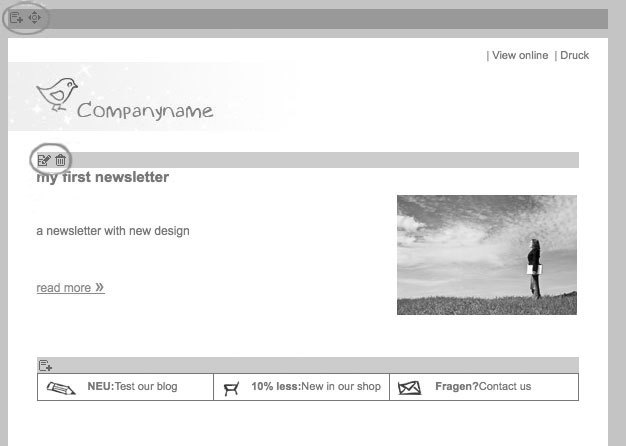 For example that is how you can reach the editing screen for one element. When using more article or introduction elements, you may change the order as you like. At the same time you can quickly introduce or delete elements. If you click on an image a window will immediately pop up in which you can edit the file, name and, if necessary, a link. Finally, you click 'Save'. The HTML and Text parts will automatically be created when using a template.