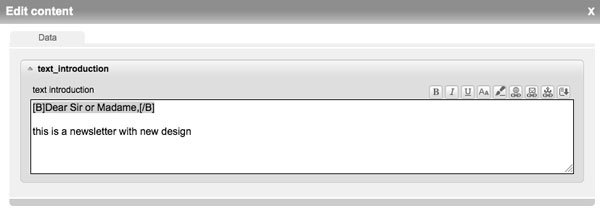 In the tab 'Text', you create a pure text email or the text part of a multipart email. There are only limited design possibilities. You may include texts and separate characters by using line breaks, distances or hyphens. Images or attachments cannot be directly integrated (indirectly via including links). Links can be included as URLs starting with http://. They are active after dispatch; meaning recipients only have to click on the links and do not have to copy them. The design of the text part will be less attractive than the HTML part. However, a text part should absolutely be created in a multipart email. Subscribers who only have the display of text activated in their email programs will otherwise not be able to see any contents.