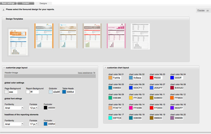 Now you also can adjust the design of your report. Choose the tab 'designs'. By default M-Tool suggests you six different layouts. HTML experts can also open the 'advanced settings' below the layouts to edit the html-code. For example you can insert your logo in th header.
