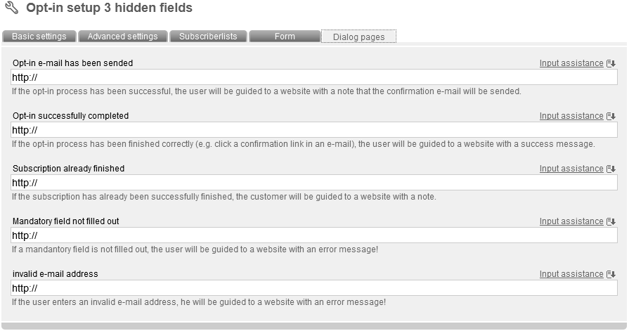 Now enter a name and an optional description for your optin setup. Then choose the 'mode' (important). The following modes are supported by 'M-Tool': Double Opt-in with confirmation e-mail (recommended as the only legally secure login variant): Interested party visits a website with an optin setup form. He enters his data into the form. He gots an e-mail with content like this: „Thank you for your optin. Please confirm the registration confirmation link to complete your registration.“ He clicks the link. Registration is completed. He gots a „welcoming“ e-mail. You can integrate information about your company and a certain design as well. Double Opt-in: Like described before, but without sending of a „welcoming“ e-mail. Confirmed Opt-In: Nach Anmeldung auf der Webseite wird sofort eine automatische Begrüßungsnachricht versendet. Single Opt-in: No e-mails will be send. There just will be a message in your browser, that registration was successfull. According to the mode you've choosed, you have to adapt different sub-options. In Tab 'advanced settings' you can deposit your e-mail address in field 'e-mail forwarding', to be informed about new subscribers. In field 'mailing for later delivery' you can determine your last sended newsletter. All new subscribers will receive your last mailing and don't have to wait for another one. To protect your optin-form against abuse, activate the invisible captcha . Captchas are often used to check if petitions are produced by a machine (robot, short: bot) or a real person. Bots are often used abusive to generate masses of subscriptions. Choose your favorite subscriberfields, which should be filled in in next tab 'Form'. After clicking 'Add subscriberfield' a pop up appears, where you can select and add subscriberfields to your optin-form. Furthermore you can add one or more subscriberlists as option(s) in a ceckbox through the button 'add subscriberlist'. Click 'sort formfields' to edit order of your fields. Click 'test form' to check your form by a preview of your optin-form. Next tab: 'Dialog pages':
