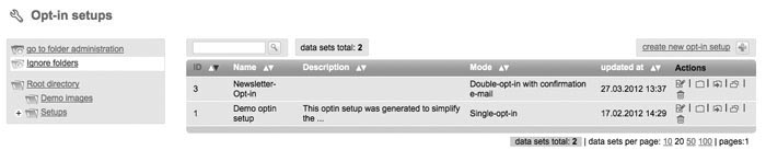 Through 'Setups' and 'Optin Setup' you can create forms, which can be included into your website. So interested parties can login automatically on your website for your subscriberlist(s). Please note: Requirement for a successfull 'optin setup' is to create an e-mail with type 'dialog mailing' for registration confirmation and welcoming, which got the status 'activated'. Otherwise those mailings will be lacking in the shortlist of mailings which you can choose for your optin setup. For an esier start M-Tool gots a „Demo optin setup“ for you. Created optin setups can be 'opend' afterwards for editing, 'moving' to another folder or 'deleting'. If you have moved an optin setup into another folder, click 'open folder' to get into. Create new Optin setup |